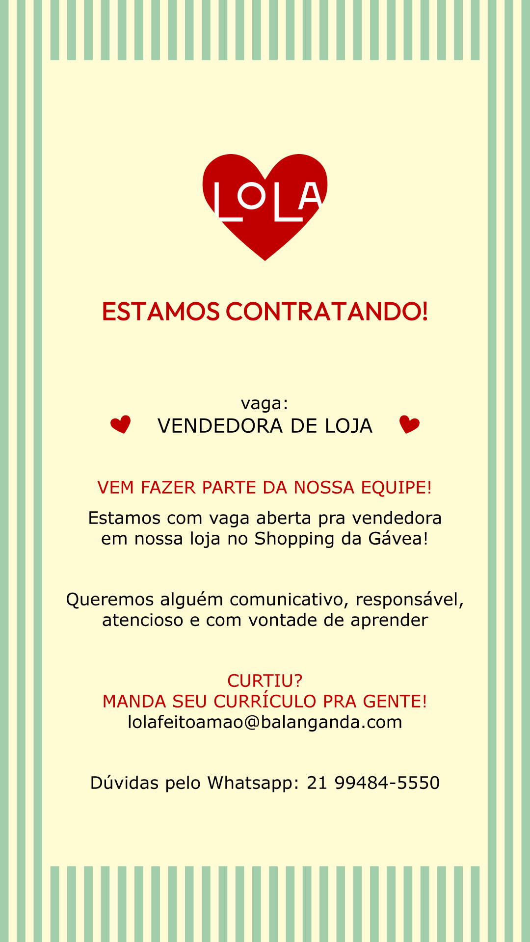 Estamos em busca de vendedoras com perfil dinâmico, boa comunicação, proatividade.Venha fazer parte da nossa equipe! 💫